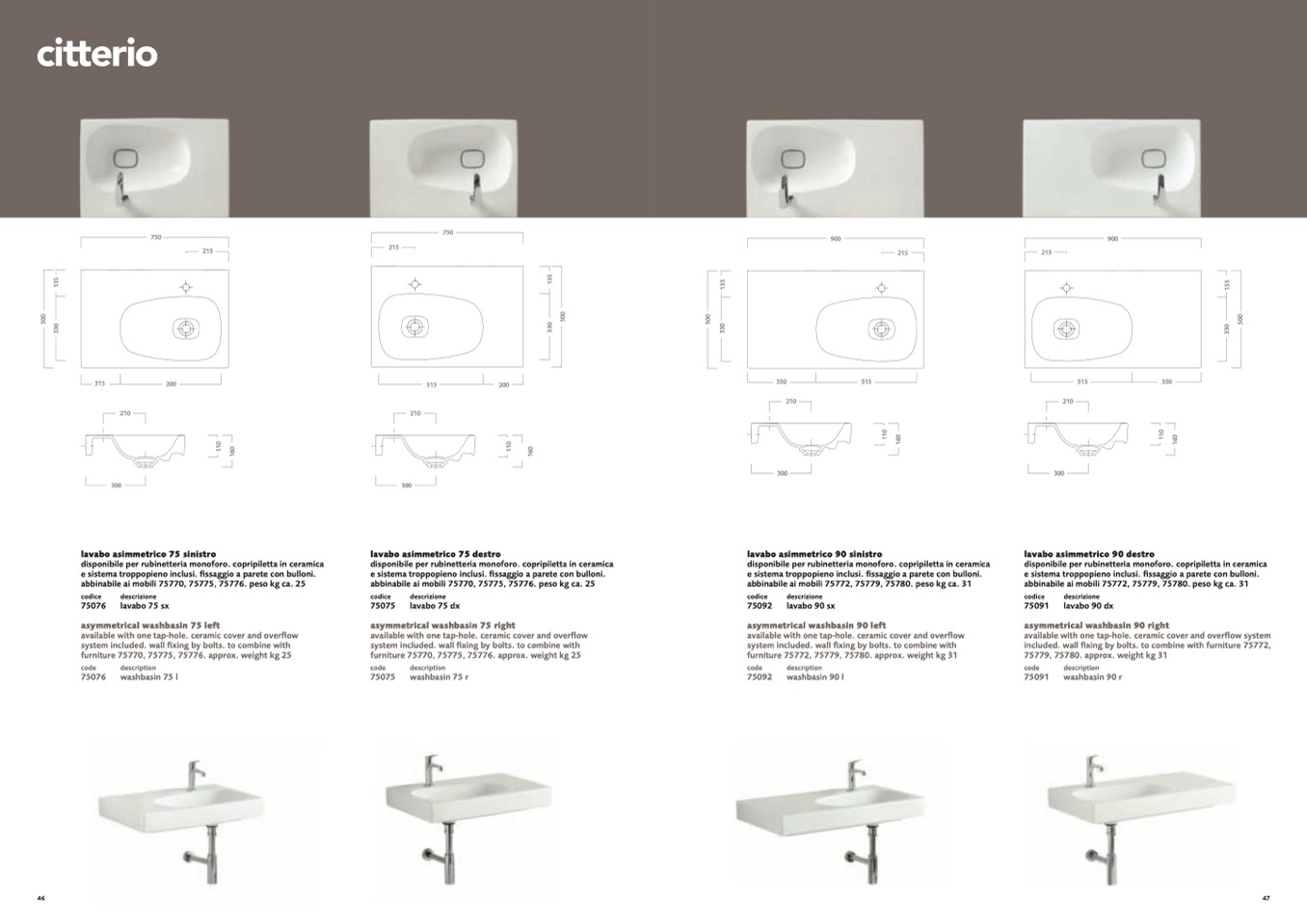 lavabo asimmetrico 75 destro