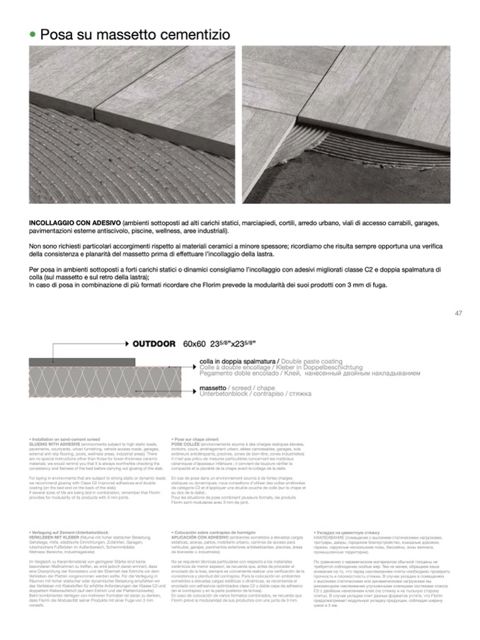 Per posa in ambienti sottoposti a forti carichi statici o dinamici consigliamo l’incollaggio con adesivi migliorati classe C2 e doppia spalmatura di