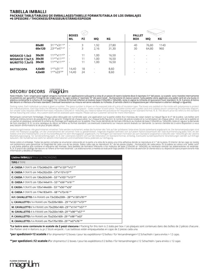 stirolo per garantire l’integrità dei singoli pezzi. Su ogni scatola e’ riportato: N° dei pezzi totali - Numerazione di ciascun pezzo. Sulla paletta viene applicata una pallet card ed una busta i