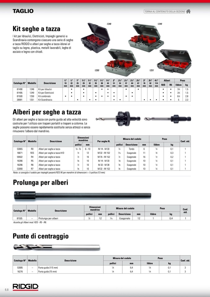 a tazza RIDGID e alberi per seghe a tazza idonei al