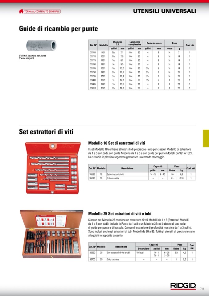 Ciascun set Modello 25 contiene un estrattore di viti Modelli da 1 a 8 (Estrattori Modelli