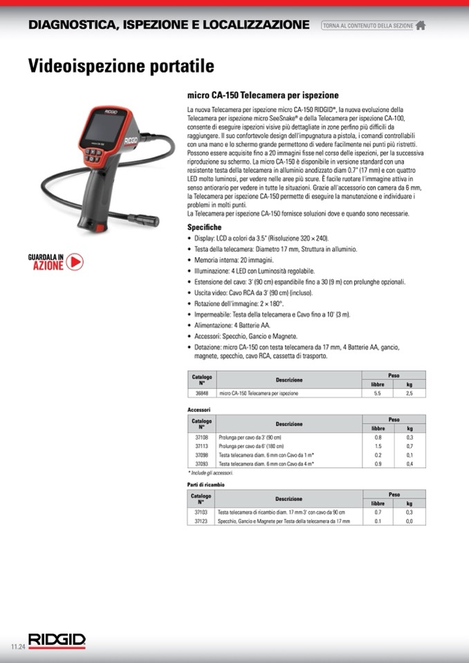 • Dotazione: micro CA-150 con testa telecamera da 17 mm, 4 Batterie AA, gancio,