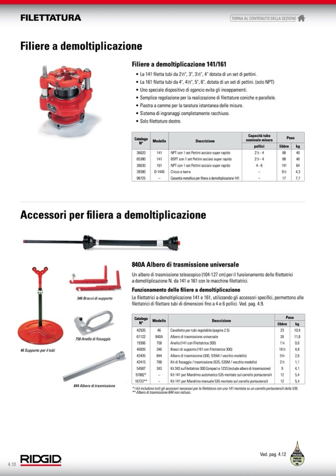 filettatrici di filettare tubi di dimensioni fino a 4 e 6 pollici. Ved. pag. 4.9.