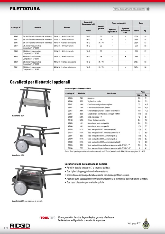 Pettini: Tutti i pettini per tubi e bulloneria universali; tutti i Pettini per bulloneria 500B, Vedere le pagine 4.31 - 4.32