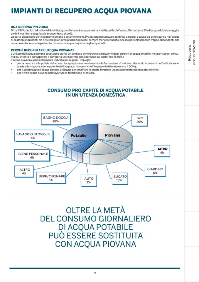 L’utilizzo dell’acqua piovana costituisce quindi un prezioso contributo alla riduzione degli sprechi di acqua potabile, n