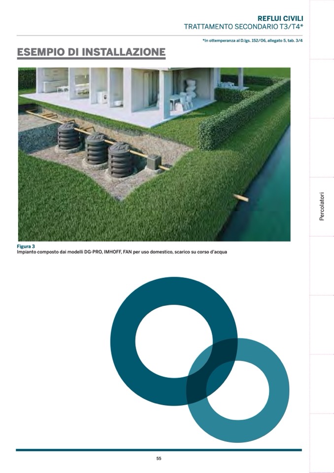 Impianto composto dai modelli DG-PRO, IMHOFF, FAN per uso domestico, scarico su corso d’acqua