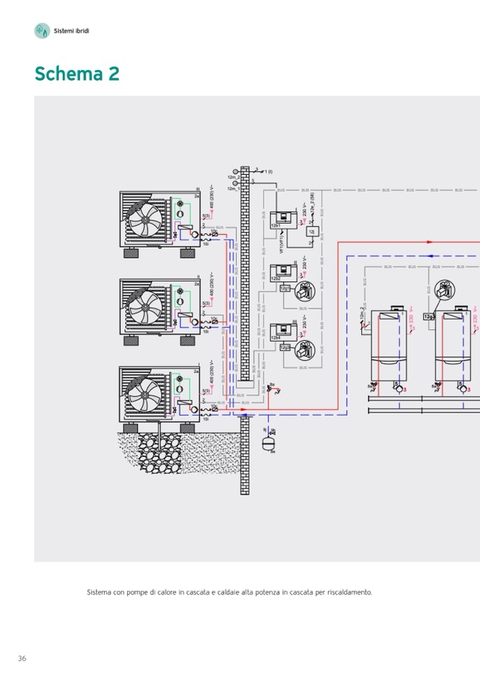 Sistema con pompe di calore in cascata e caldaie alta potenza in cascata per riscaldamento.