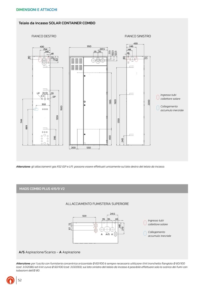 Attenzione: gli allacciamenti gas R32 (GP e LP) possono essere effettuati unicamente sul lato destro del telaio da incasso.