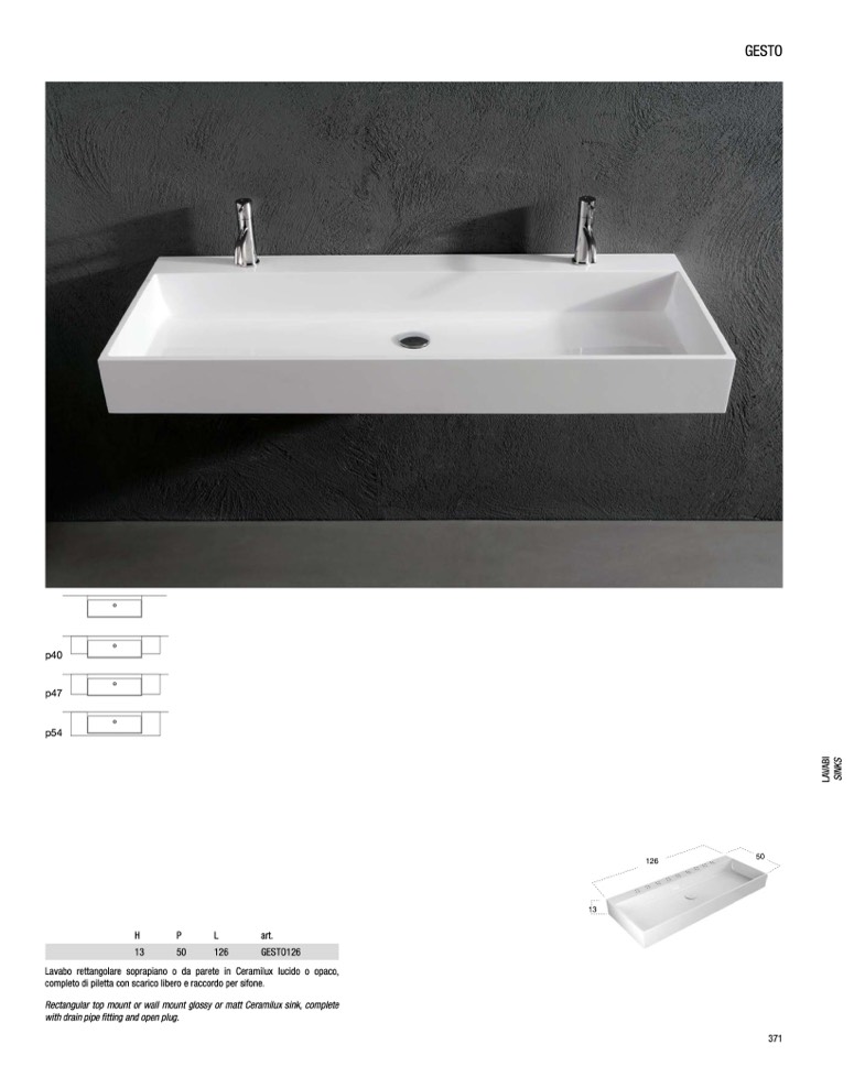 Lavabo rettangolare soprapiano o da parete in Ceramilux lucido o opaco,