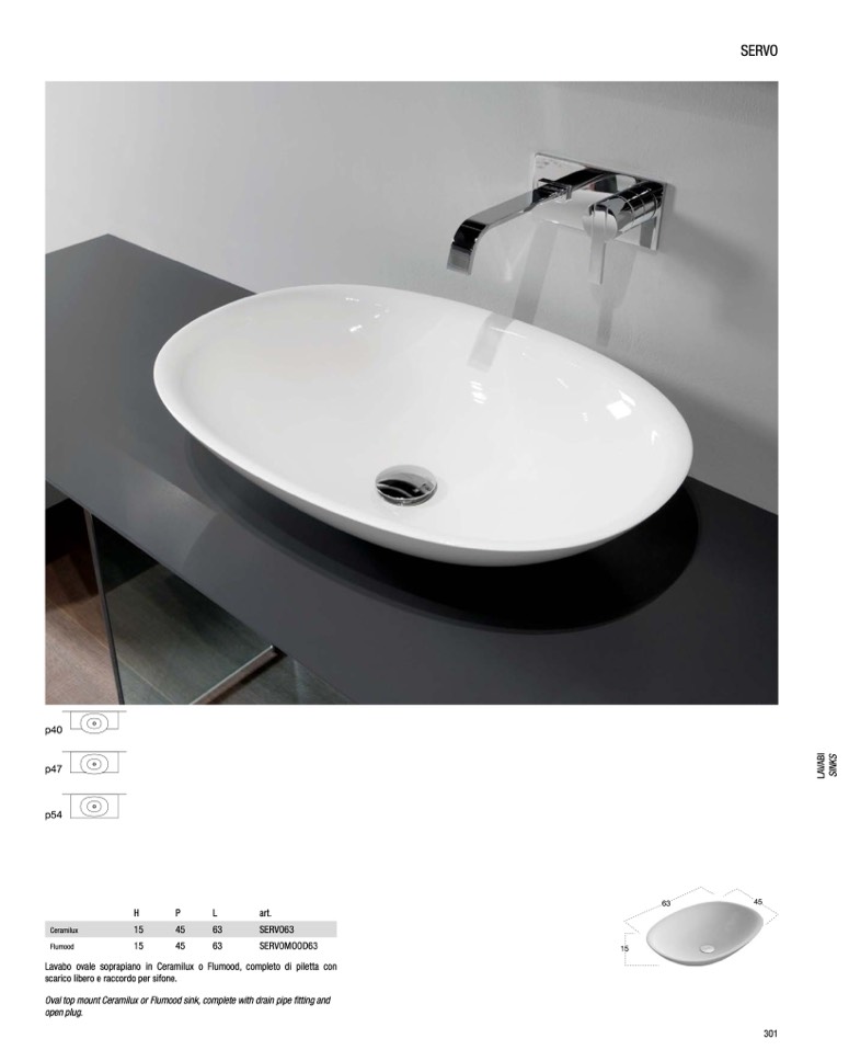 Lavabo ovale soprapiano in Ceramilux o Flumood, completo di piletta con