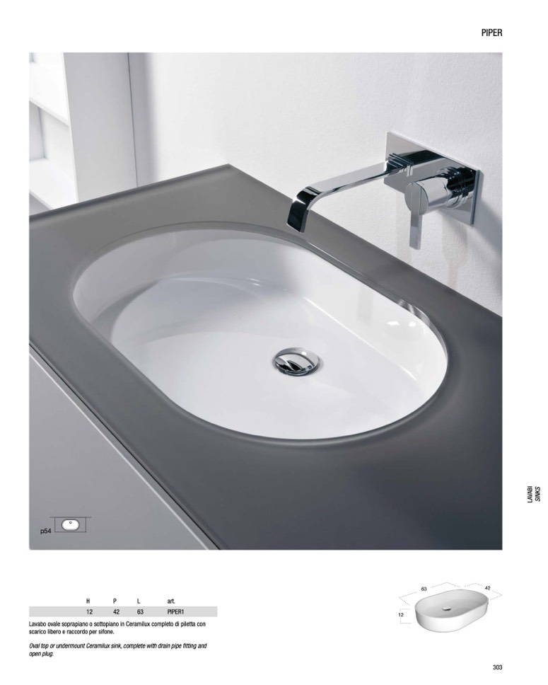 Oval top or undermount Ceramilux sink, complete with drain pipe fitting and
