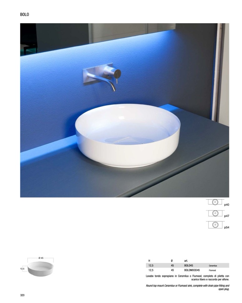 Lavabo tondo soprapiano in Ceramilux o Flumood, completo di piletta con