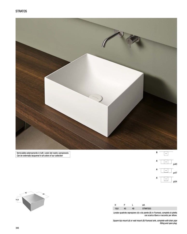 Lavabo quadrato soprapiano (A) o da parete (B) in Flumood, completo di piletta