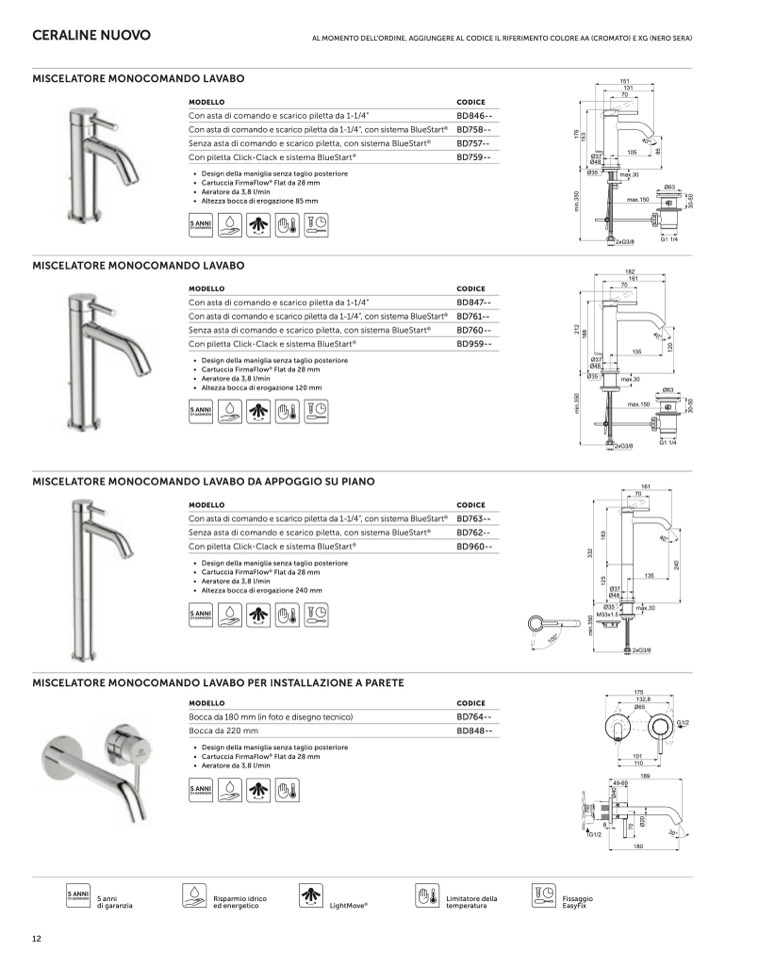 Con asta di comando e scarico piletta da 1-1/4”, con sistema BlueStart