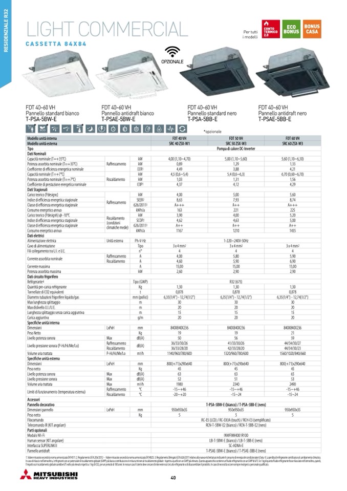 1. Valore misurato secondo la norma armonizzata EN14511. 2. Regolamento UE N.206/2012 - - Valore misurato secondo la norma armonizzata EN14825. 3. Regolamento Delegato UE N.626/2011 relativo alla nuova etichettatura indicante il consumo di energia dei condizionatori d'aria. 4. La perdita di refrigerante contribuisce al cambiamento climatico.
