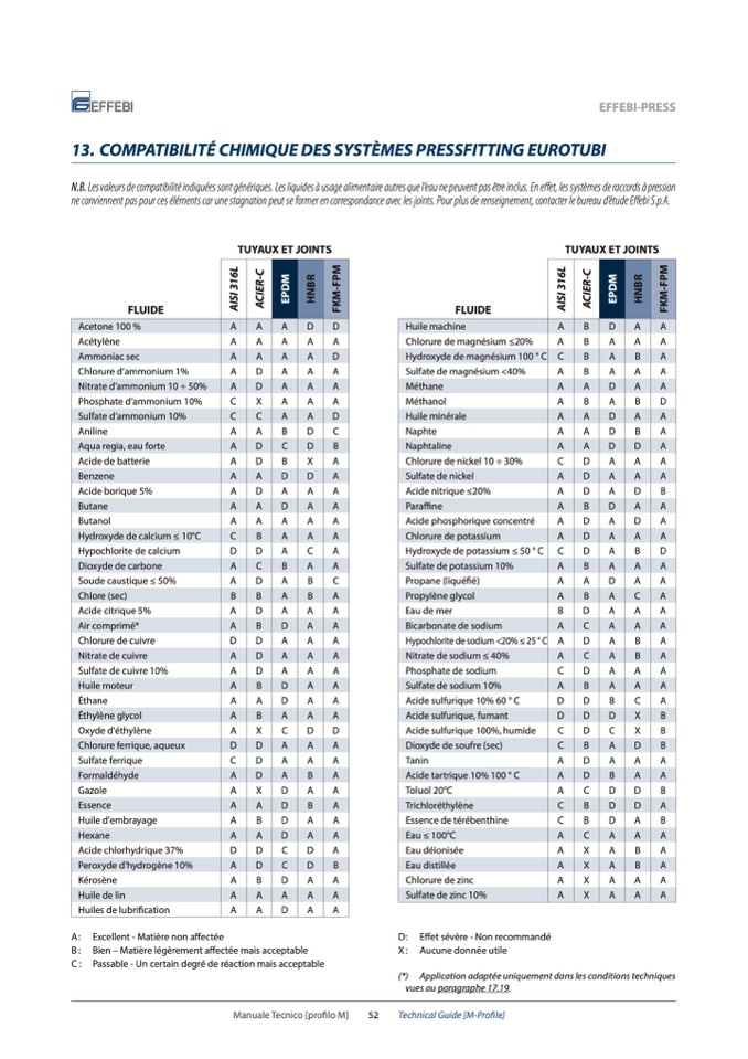 N.B. Les valeurs de compatibilité indiquées sont génériques. Les liquides à usage alimentaire autres que l’eau ne peuvent pas être inclus. En effet, les systèmes de raccords à pression