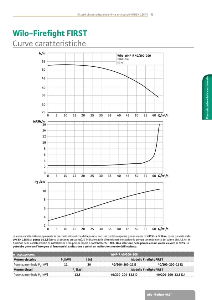 UNI EN 12845 al punto 10.1.b (curva di potenza crescente). E’ indispensabile dimensionare e scegliere la pompa tenendo conto del valore di N.P.S.H.r in