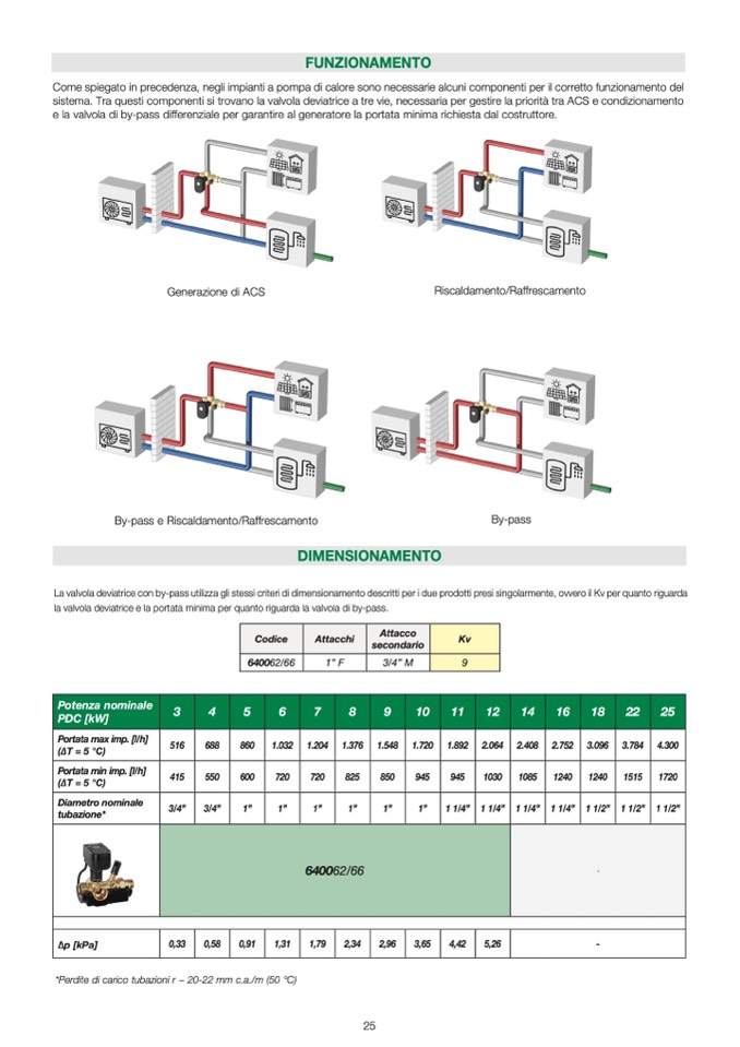 La valvola deviatrice con by-pass utilizza gli stessi criteri di dimensionamento descritti per i due prodotti presi singolarmente, ovvero il Kv per quanto riguarda