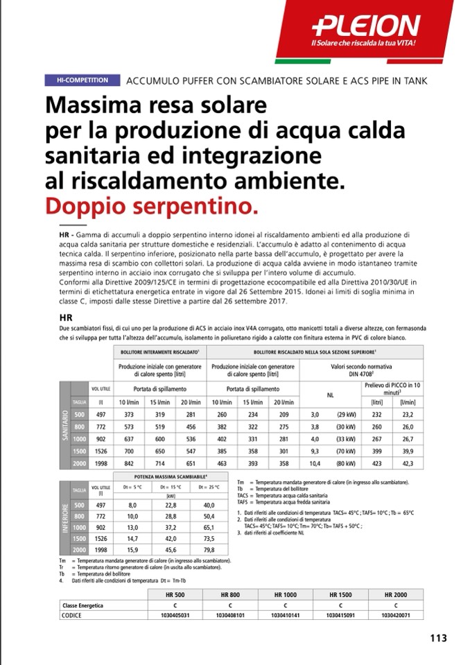 HR - Gamma di accumuli a doppio serpentino interno idonei al riscaldamento ambienti ed alla produzione di