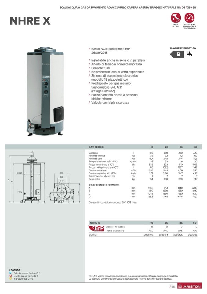 SCALDACQUA A GAS DA PAVIMENTO AD ACCUMULO CAMERA APERTA TIRAGGIO NATURALE 18 / 26 / 36 / 60