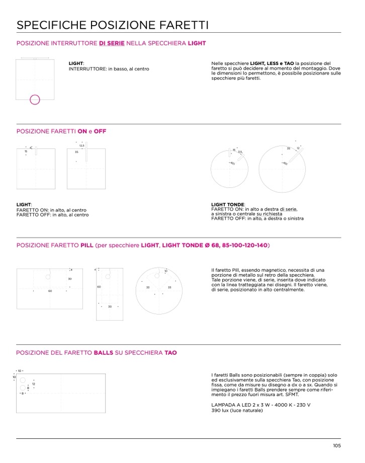 Nelle specchiere LIGHT, LESS e TAO la posizione del