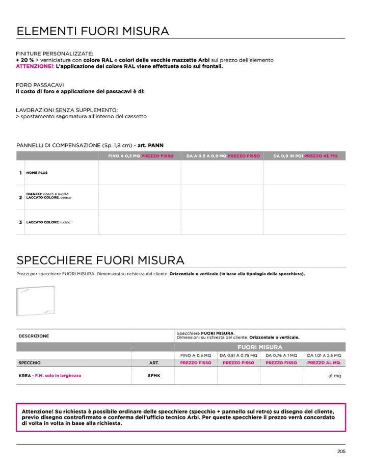 previo disegno controfirmato e conferma dell'ufficio tecnico Arbi. Per queste specchiere il prezzo verrà concordato