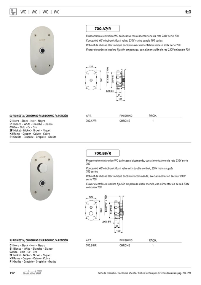 Flussometro elettronico WC da incasso con alimentazione da rete 230V serie 700