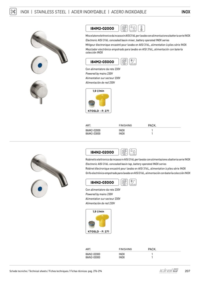 Mitigeur électronique encastré pour lavabo en AISI 316L, alimentation à piles série INOX