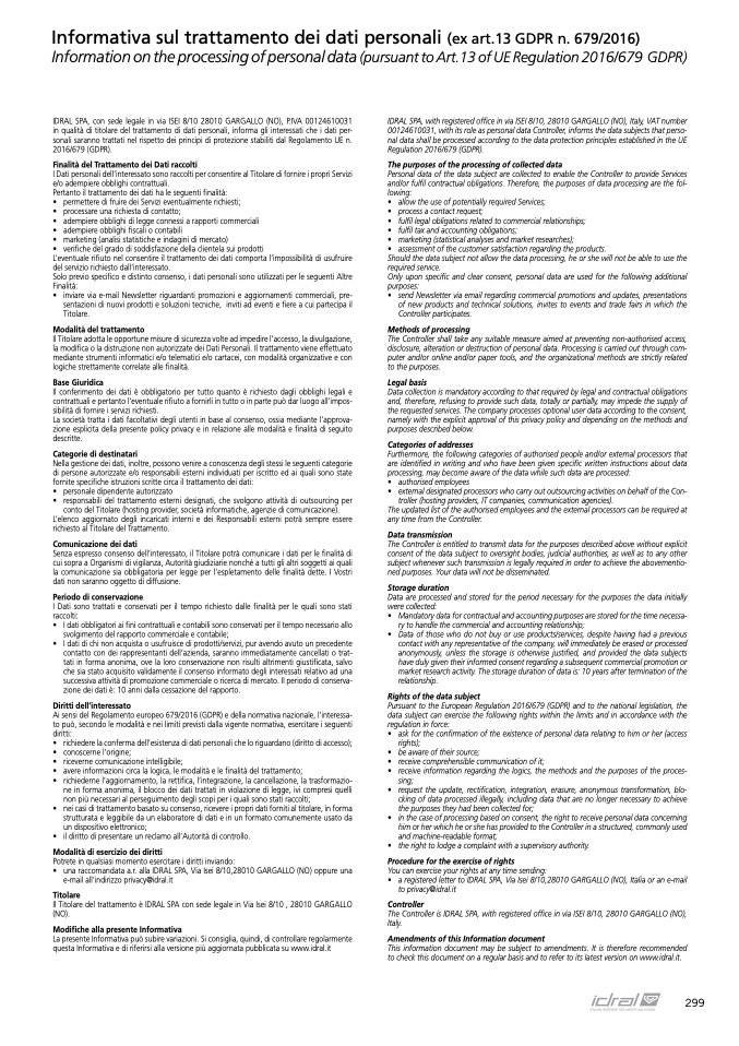 IDRAL SPA, with registered office in via ISEI 8/10, 28010 GARGALLO (NO), Italy, VAT number