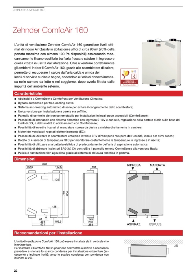L’unità di ventilazione ComfoAir 160 può essere installata sia in verticale che