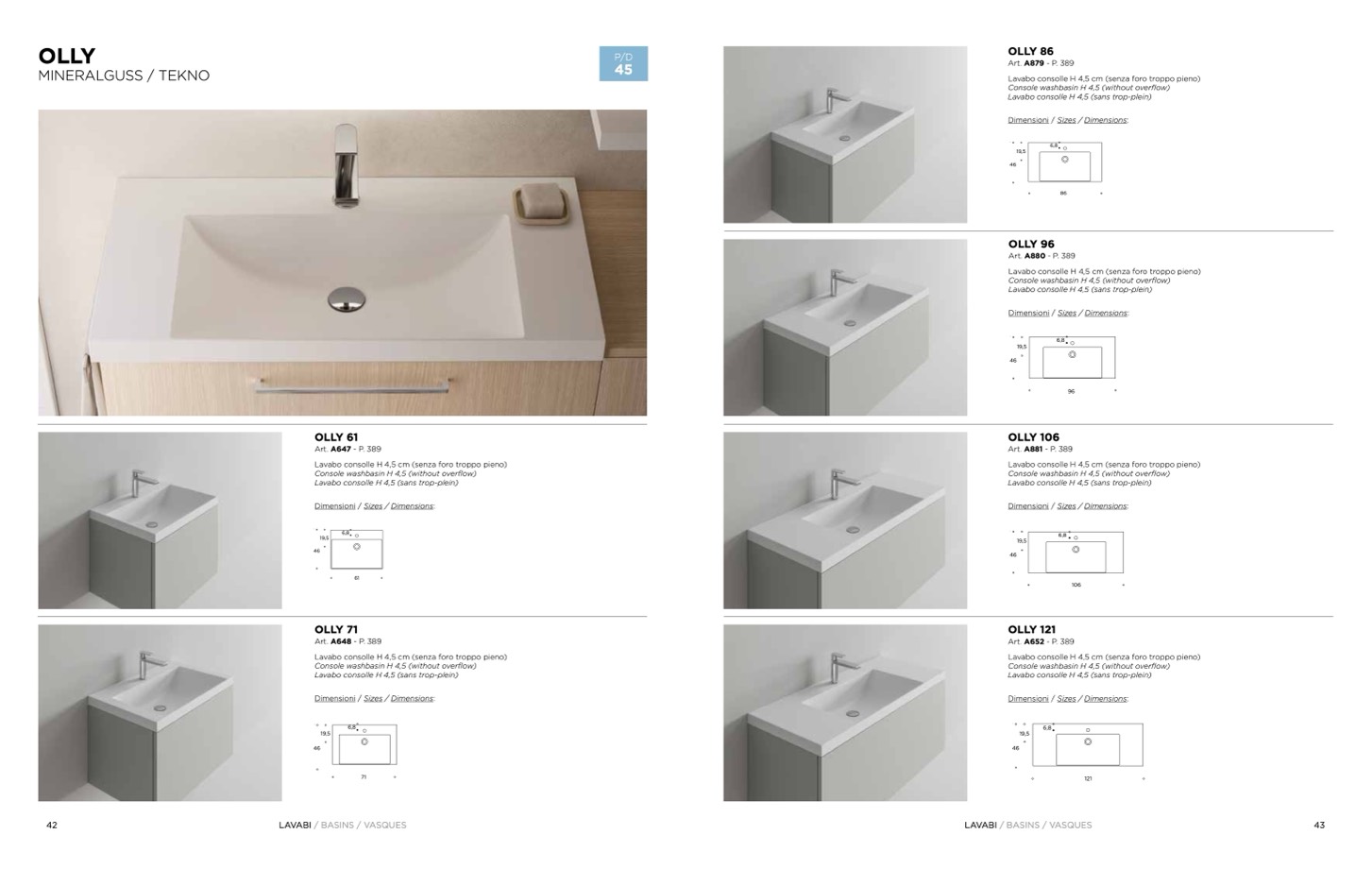 Lavabo consolle H 4,5 cm (senza foro troppo pieno)