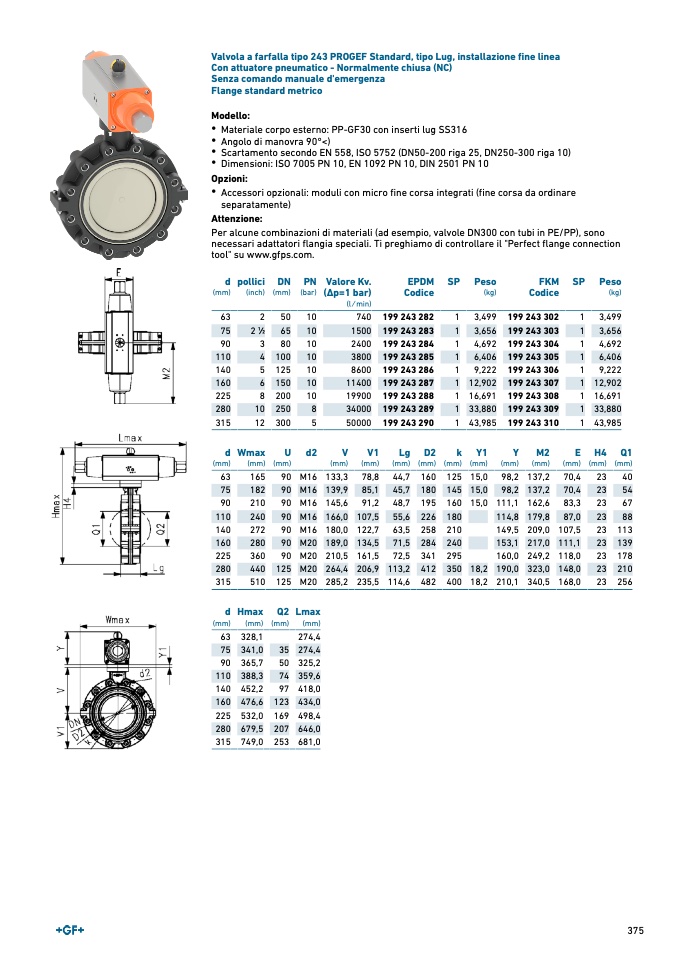 Valvola a farfalla tipo 243 PROGEF Standard, tipo Lug, installazione fine linea