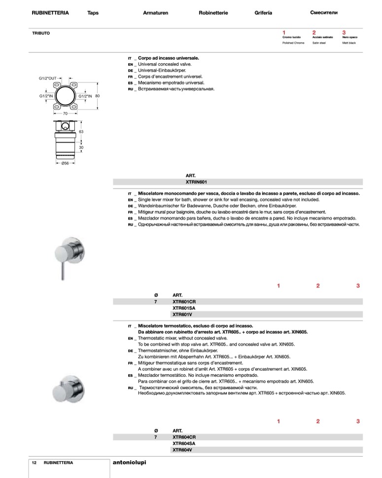 Da abbinare con rubinetto d'arresto art. XTR605.. + corpo ad incasso art. XIN605.