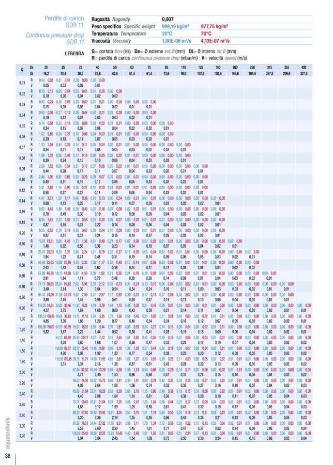 Q= portata flow (l/s) De= Ø esterno ext.Ø (mm) Di= Ø interno int.Ø (mm)