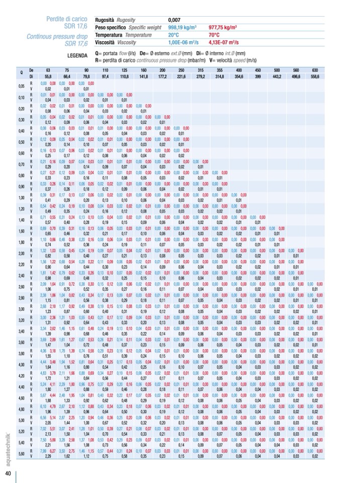 Q= portata flow (l/s) De= Ø esterno ext.Ø (mm) Di= Ø interno int.Ø (mm)