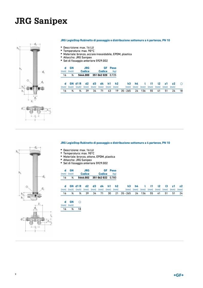 JRG LegioStop Rubinetto di passaggio e distribuzione sottomuro a 4 partenze, PN 10