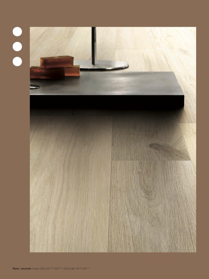 floor: amande matte 20x120 77/8”x471/4” 26,5x180 103/7”x706/7”