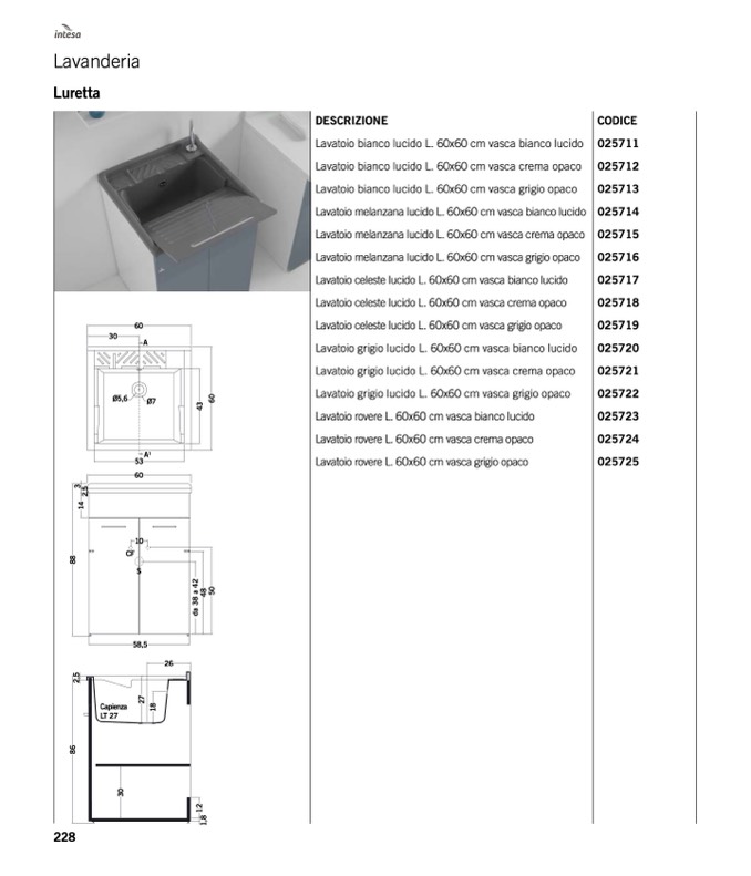 Lavatoio bianco lucido L. 60x60 cm vasca crema opaco