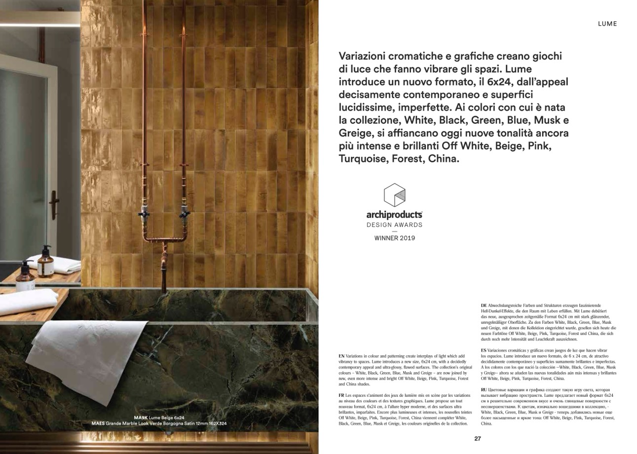 vibrancy to spaces. Lume introduces a new size, 6x24 cm, with a decidedly