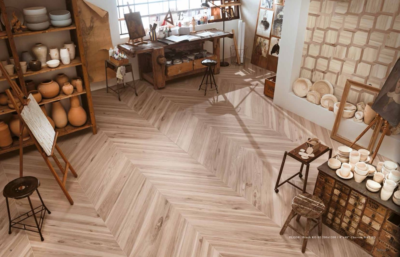 FLOOR: Peach KO 02 200x1200 / 8”x48” Chevron NAT SQ