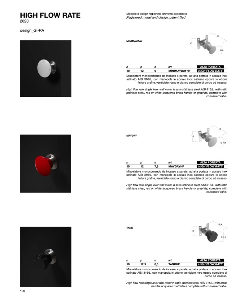 satinato AISI 316/L, con manopola in acciaio inox satinato oppure in ottone