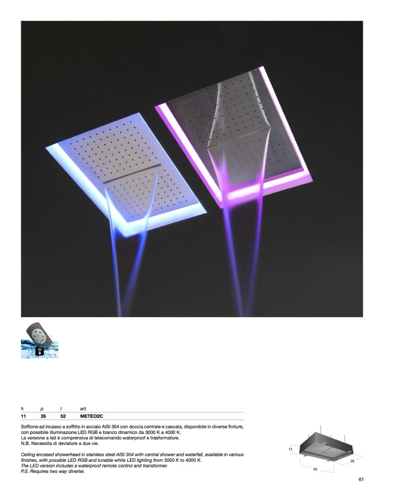 Ceiling encased showerhead in stainless steel AISI 304 with central shower and waterfall, available in various
