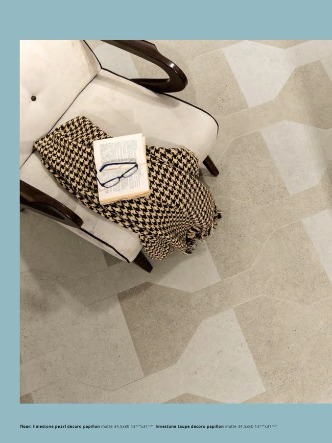 floor: limestone pearl decoro papillon matte 34,5x80 134/7”x311/2” limestone taupe decoro papillon matte 34,5x80 134/7”x311/2”