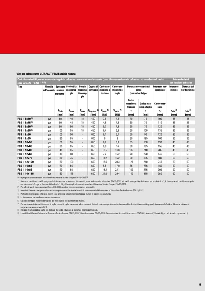 7) Per combinazioni di azioni di trazione, di taglio o azioni di taglio con braccio a leva (momenti flettenti), così come per interassi o distanze dal bordo ridotti (ancoranti in gruppo) si raccomanda l'utilizzo del nostro software di
