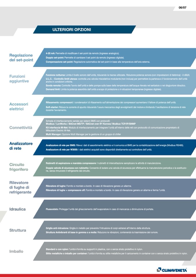 Rilevatore di fughe + compressore off: Fornito e montato a bordo. In caso di rilevazione genera un allarme e ferma l’unità.