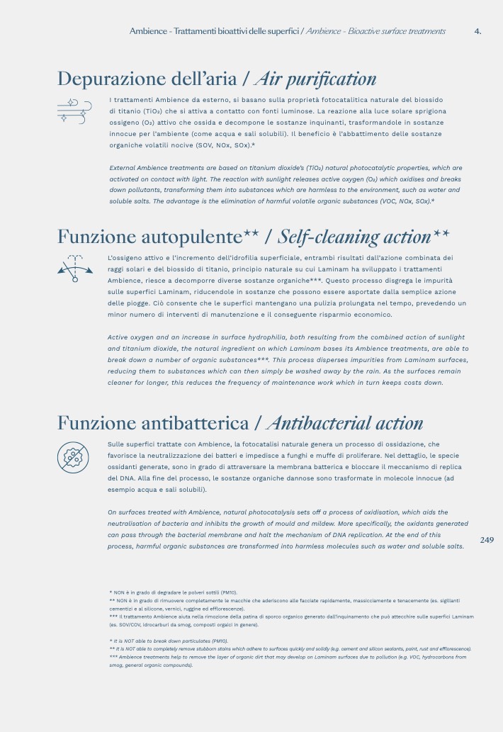 *** Ambience treatments help to remove the layer of organic dirt that may develop on Laminam surfaces due to pollution (e.g. VOC, hydrocarbons from
