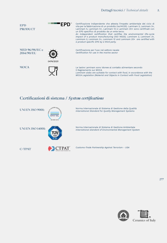 Laminam 5, Laminam 5+, Laminam 12 and Laminam 20+ are certified with
