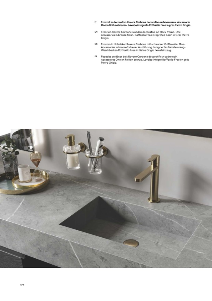 finitura bronzo. Lavabo integrato Raffaello Free in gres Pietra Grigia.