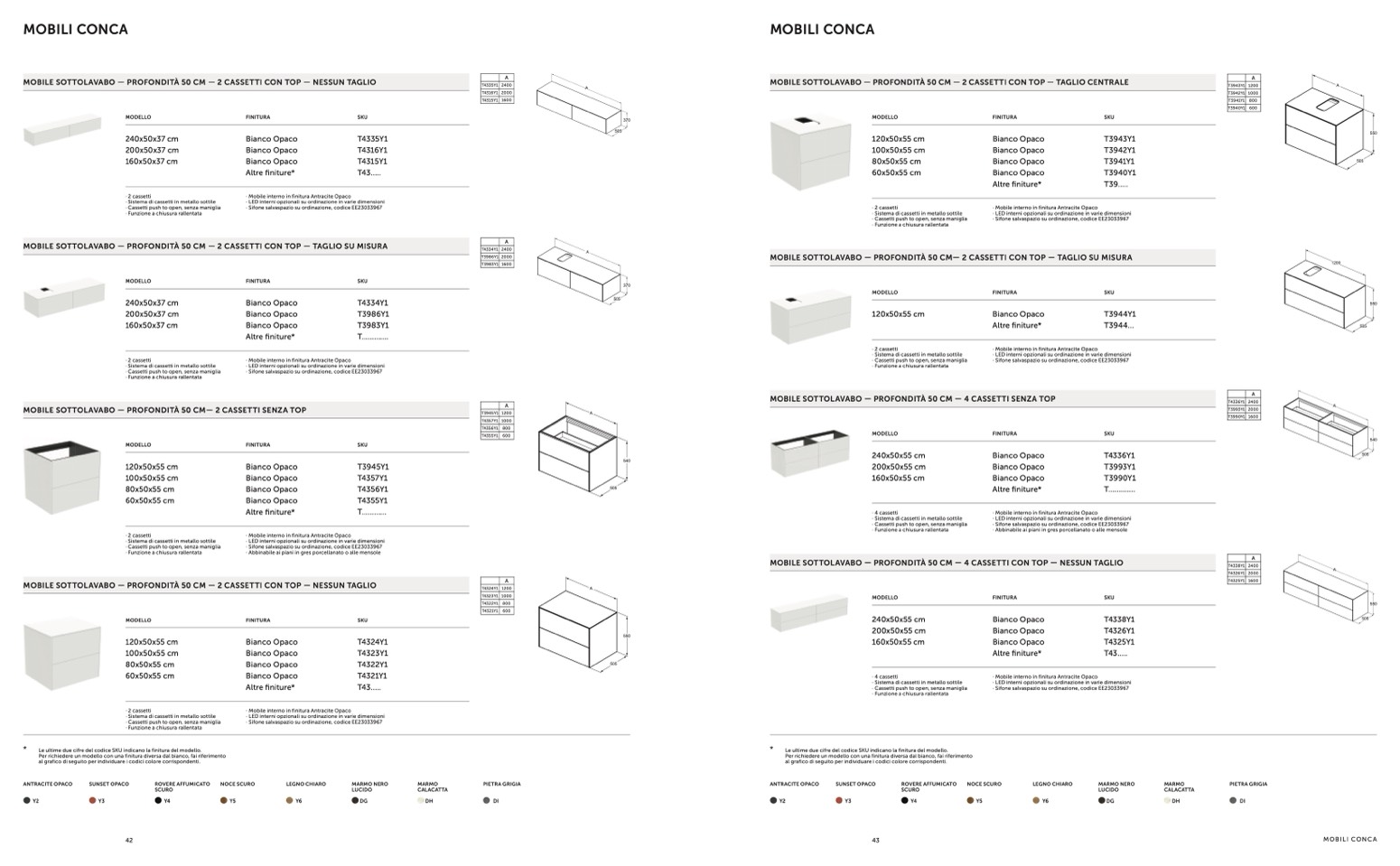 MOBILE SOTTOLAVABO — PROFONDITÀ 50 CM — 2 CASSETTI CON TOP — NESSUN TAGLIO