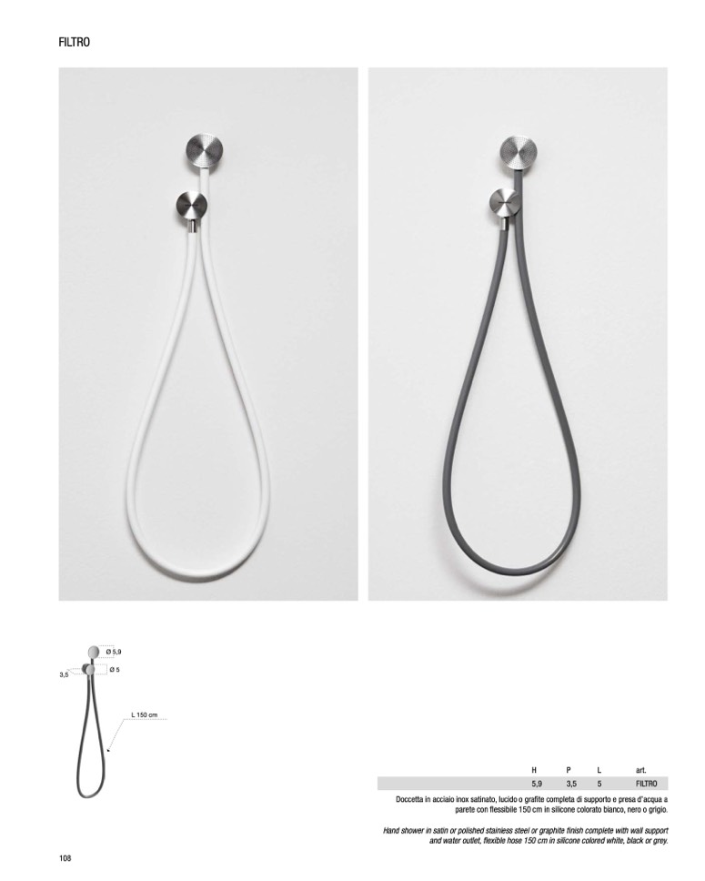 and water outlet, flexible hose 150 cm in silicone colored white, black or grey.